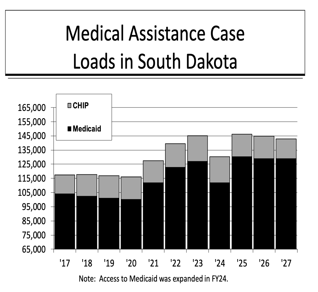 South Dakota’s Medicaid case loads increased after the coronavirus pandemic, before South Dakota expanded Medicaid. We thought Medicaid expansion could bring 42,500 new beneficiaries onto the rolls, and in 2023 the state budgeted for up to 52,000 new enrollees, but Rhoden’s proposed budget predicts the number of Medicaid expansion adults in Fiscal Year 2027 will be 30,367, the same as estimated for this budget year. With that level of participation in Medicaid expansion, total adult Medicaid case loads will match the peak they were at before expansion.