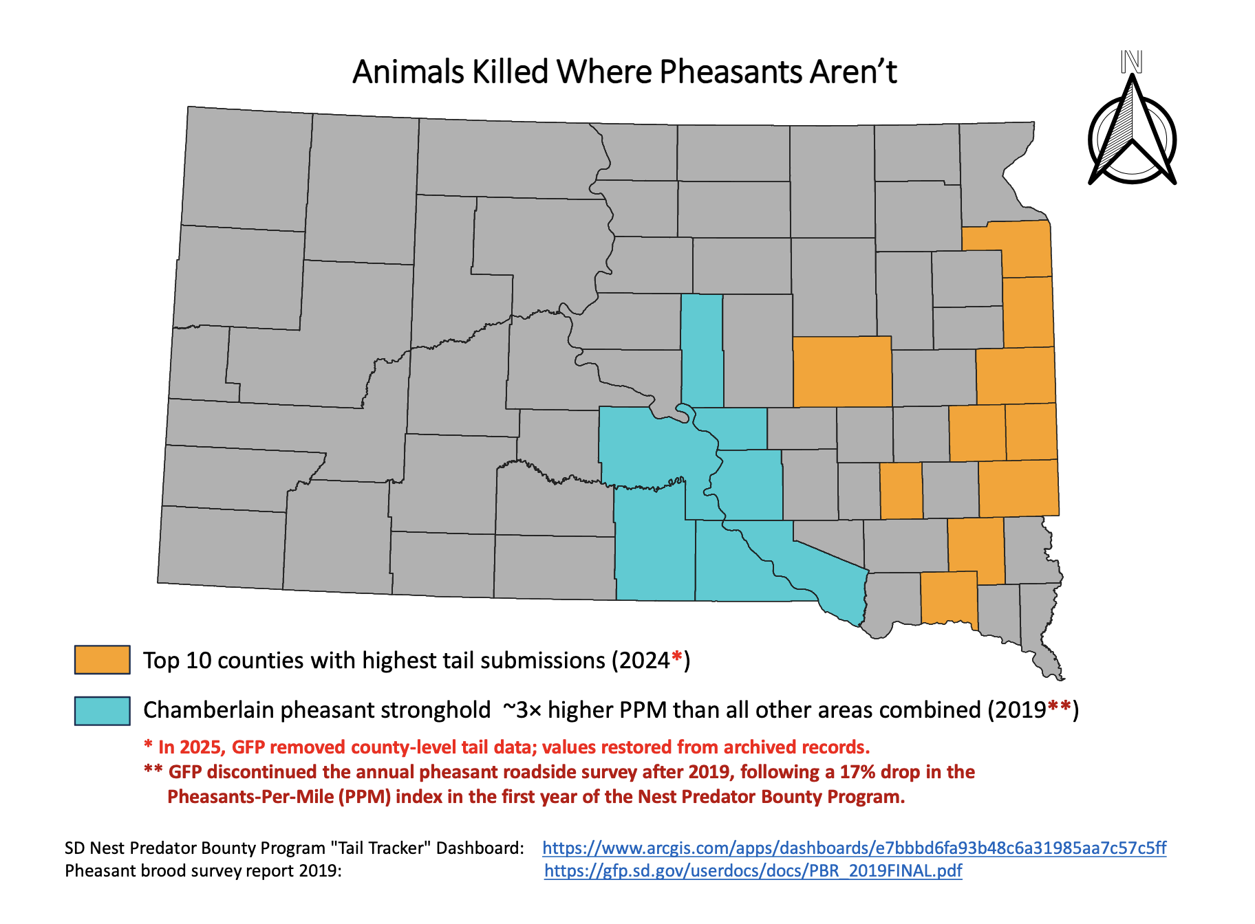 The NPBP is implemented statewide, with most program activity occurring outside core pheasant strongholds (Chamberlain local area). As a result, animals are being killed haphazardly, primarily near urban areas along the I-29 corridor (see attached map), leading to inefficient use of public funds where measurable population-level benefit is unlikely. If the stated objective is to increase pheasant production, predator management should be focused in high-density brood areas, not statewide. Attempting to protect nests where they are rare is unlikely to produce measurable benefits, as predators in such areas primarily rely on alternative food sources [Dr. Alexey Egorov, letter to Game Fish and Parks Commission, 2026.03.01, in meeting agenda packet, 2026.03.05–06, p. 213].